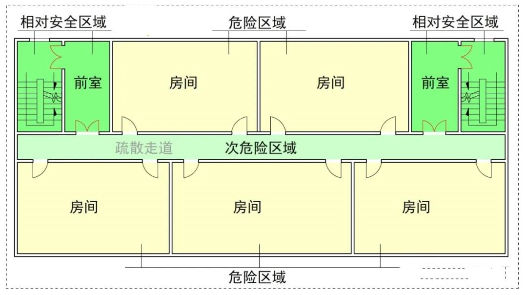 風險逐級遞減,是所有安全疏散路徑須遵行的基本準則,是安全疏散設計的基礎!合理的疏散路徑應為“危險區域(房間)→次危險區域(疏散走道)→相對安全區域(疏散樓梯間或前室)→室外安全區域(建筑室外)”。