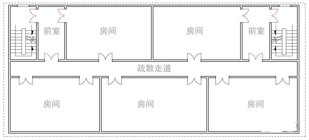 二 、疏散走道作為緩沖空間,能有效保證疏散樓梯間和前室的安全性。除非是房間專用疏散樓梯的形式,其他房間疏散門不宜直接開向疏散樓梯間或前室,宜通過疏散走道進入前室。