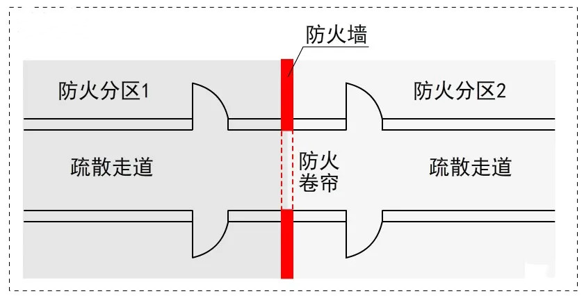 通常情況下,疏散走道是針對(duì)特定防火分區(qū)的概念,火災(zāi)條件下,人員從房間進(jìn)入疏散走道,通過(guò)所在防火分區(qū)的安全出口進(jìn)行疏散,沒(méi)必要通過(guò)疏散走道向其他防火分區(qū)疏散(除非是借用相鄰防火分區(qū)安全出口的情形),不同防火分區(qū)可采取防火卷簾等防火分隔措施直接隔離。