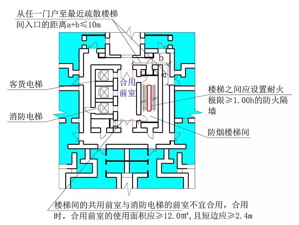 高層公共建筑的疏散樓梯,當分散設置確有困難且從任一疏散門至最近疏散樓梯間入口的距離不大于10m時,可采用剪刀樓梯間,但應符合下列規定:1)樓梯間應為防煙樓梯間。2)梯段之間應設置耐火極限不低于1.00h的防火隔墻。3)樓梯間的前室應分別設置。