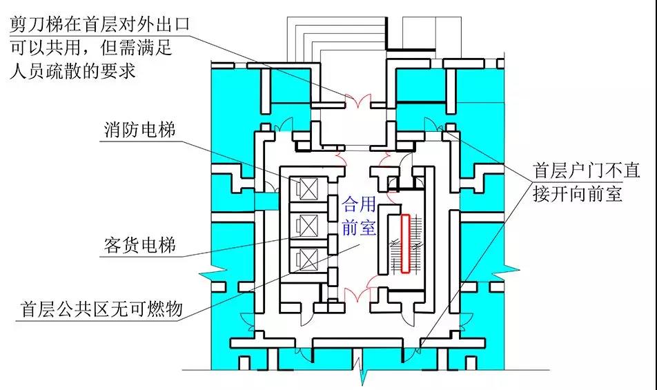 1)樓梯間的防煙前室,要盡可能分別設置,以提高其防火安全性。2)當兩部剪刀樓梯間共用前室時,進入剪刀樓梯間前室的入口應該位于不同方位,不能通過同一個入口進入共用前室,入口之間的距離仍要不小于5m。3)在首層的對外出口,要盡量分開設置在不同方向。4)當首層的公共區無可燃物且首層的戶門不直接開向前室時,剪刀梯在首層的對外出口可以共用,但寬度需滿足人員疏散的要求。