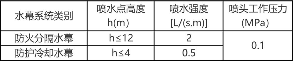 一、水幕系統的設計基本參數應符合下表的規定: 注: