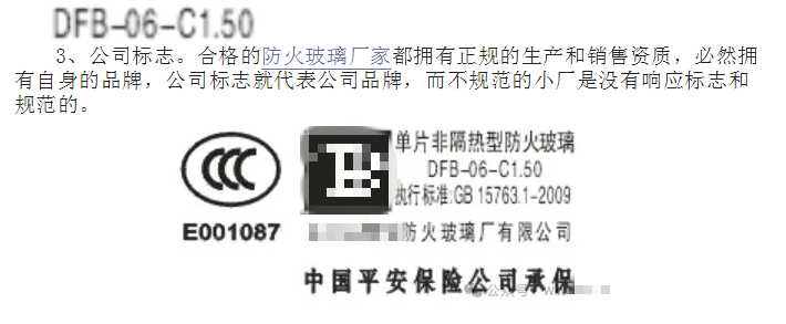 2、產(chǎn)品類型標(biāo)識(shí)。在《建筑用安全玻璃 第1部分:防火玻璃 GB15763.1-2009》中明確規(guī)定了復(fù)合防火玻璃標(biāo)記為:FFB;而規(guī)定了單片防火玻璃標(biāo)記為:DFB。例如:FFB-35-A1.50(復(fù)合防火玻璃,公稱厚度是35mm,耐火隔熱性是A類,耐火隔熱時(shí)間是1.5小時(shí)),第一項(xiàng)代表產(chǎn)品結(jié)構(gòu)類型,第二項(xiàng)代表防火玻璃公稱厚度,第三項(xiàng)代表防火玻璃耐火性能及用小時(shí)為單位表示的時(shí)間。不管是哪種類型防火玻璃每一片都需要按照以上規(guī)范進(jìn)行嚴(yán)格標(biāo)注。