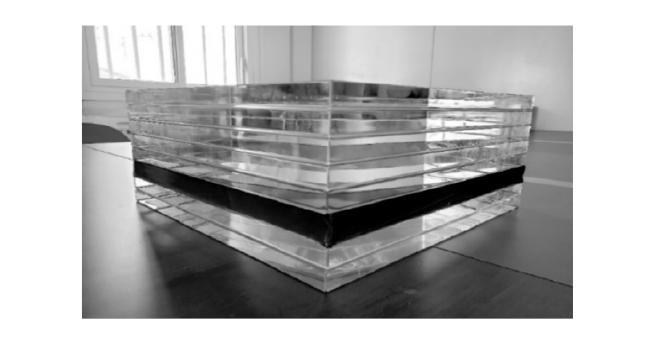 本工程全玻幕墻設計采用自承重互為支撐體系,玻璃配置為(15+2.28 SGP+15+2.28 SGP+15+2.28 SGP+15+2.28 SGP+15+20 A+15+2.28 SGP+15)mm鋼化夾膠中空超白玻璃,玻璃共7層,總厚度達136.4 mm,最大寬度2.5 m,最大高度15.3 m,最大尺寸單塊玻璃重量達10.64 t。單塊面積38.25 ㎡,遠大于JGJ 113—2015《建設玻璃應用技術規程》夾層玻璃最大許用面積為8 m2的規定。大玻璃膠縫設計寬度為35 mm,遠大于JGJ 102—2003《玻璃幕墻工程技術規范》中隱框玻璃幕墻的硅酮結構密封膠的粘接厚度應不大于12 mm的規范規定。鋼化夾膠中空超白玻璃如圖3所示。