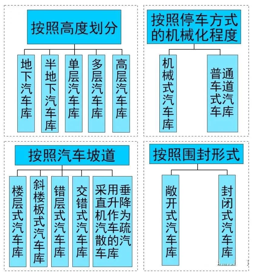 依據不同的分類標準,汽車庫的分類形式很多,通常可以按照高度、機械化程度、汽車坡度和圍封形式等進行劃分。